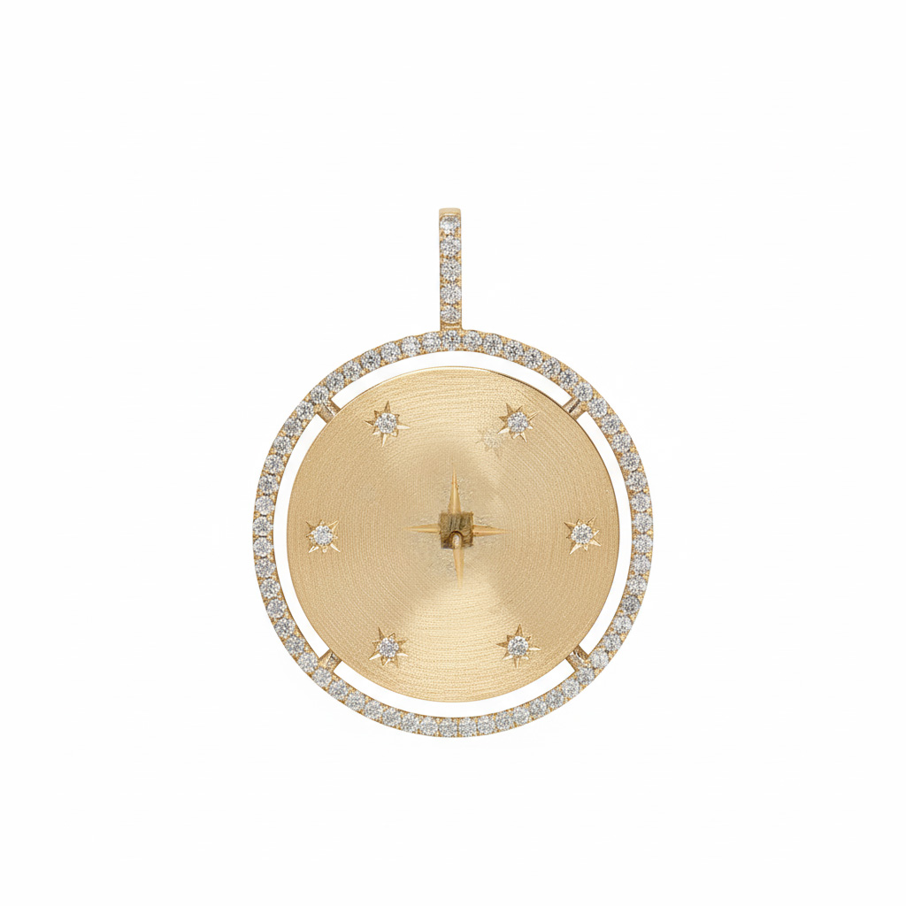 La médaille symbole personnalisable grand modèle est une médaille en or 14 carats et saphirs blancs sur lequel vous pouvez fixer le symbole de votre choix.