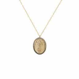 Le collier médaille oiseaux est composé d’or 14 carats et serti de 34 saphirs gris.